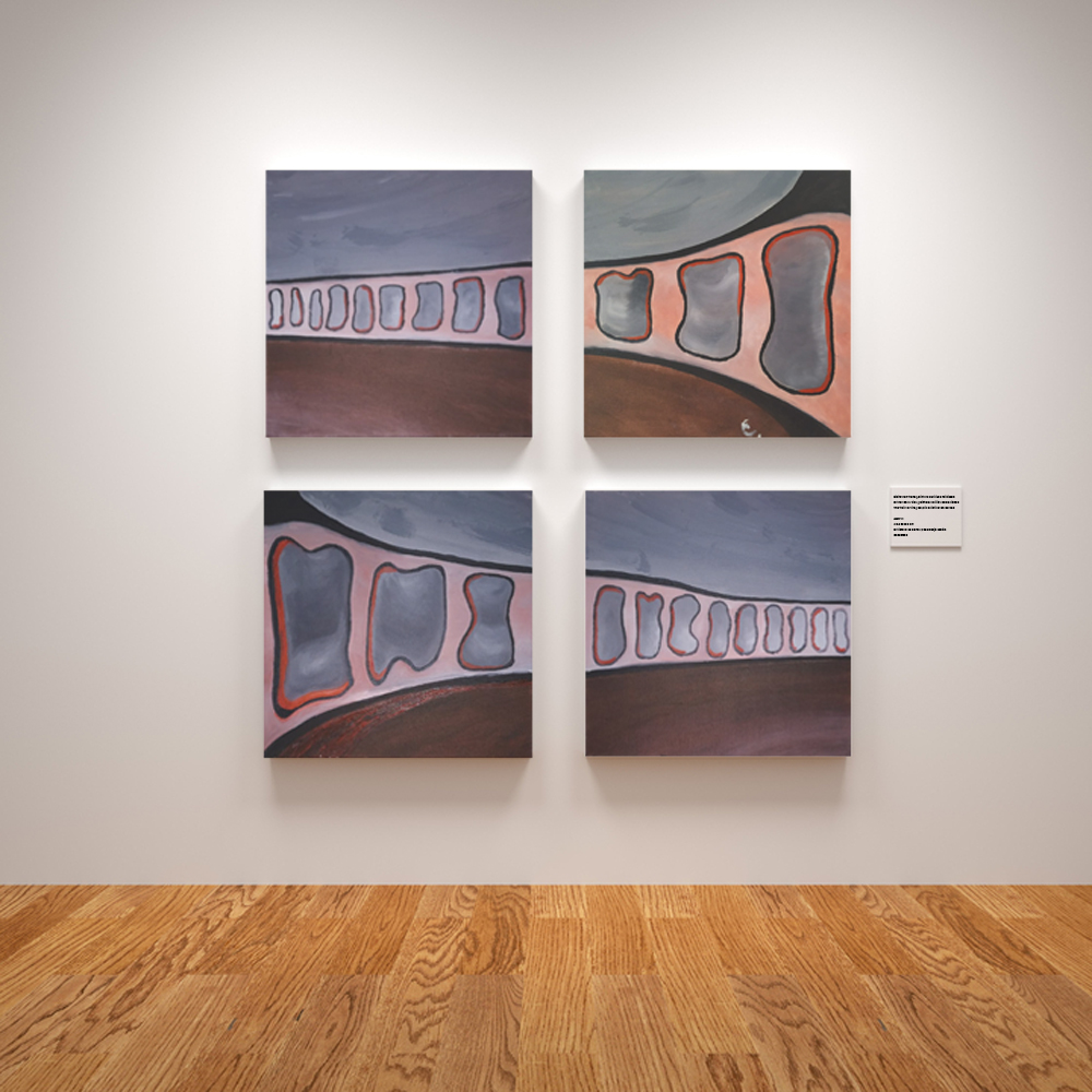 The palette, rich in browns, soft reds, and deep grays, creates an atmosphere of silent contemplation. Each piece, an independent unit, reinforces the idea that life advances in interconnected yet unique stretches. “The Train of Life” does not describe; it proposes a direct experience of the rhythm of being. It is a work charged with spatial resonance, inviting the viewer to pause and feel the present as a visual phenomenon, activating consciousness beyond personal narrative.