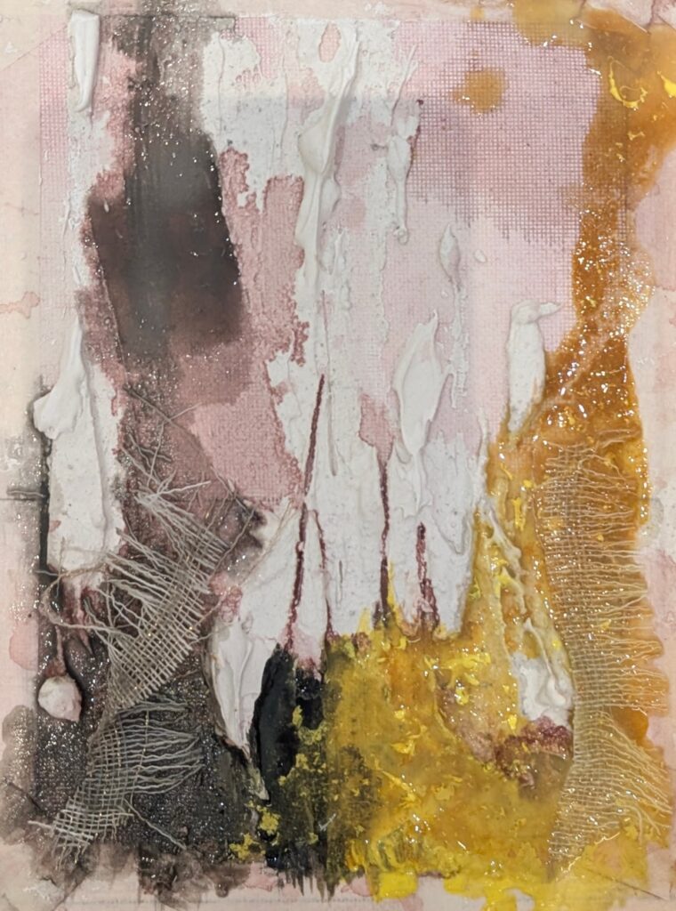 Created through architectural layering: intertwined wire, straight and level lines, and twisted steel over lettering. Fine materials, delicate wire… objects with history. Nuclear white, dirty grey with dust-black… rusted wire or small found objects that carry meaning—saltpeter, the sea, the weathering of materials on the coast and at the moment of departure. Lost illusions transformed into stability and maturity.
