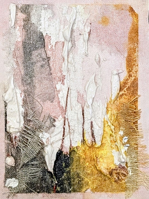 Technique & Materiality: This piece features a dynamic juxtaposition of newspaper clippings and fluid acrylic washes. The plaster relief appears to erode from the edges, revealing layers of information beneath. The high-gloss finish on the sculpted sections highlights the contrast with the matte, absorbent quality of the paper.