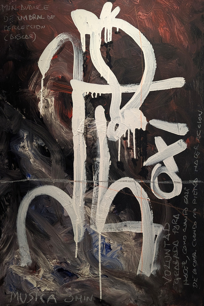 Technique & Materiality: This work utilizes gestural brushstrokes that create a sense of turbulence. A large white arch dominates the composition alongside technical handwritten notes such as “minimum advance of perception threshold,” applied over a background of grays and blacks.