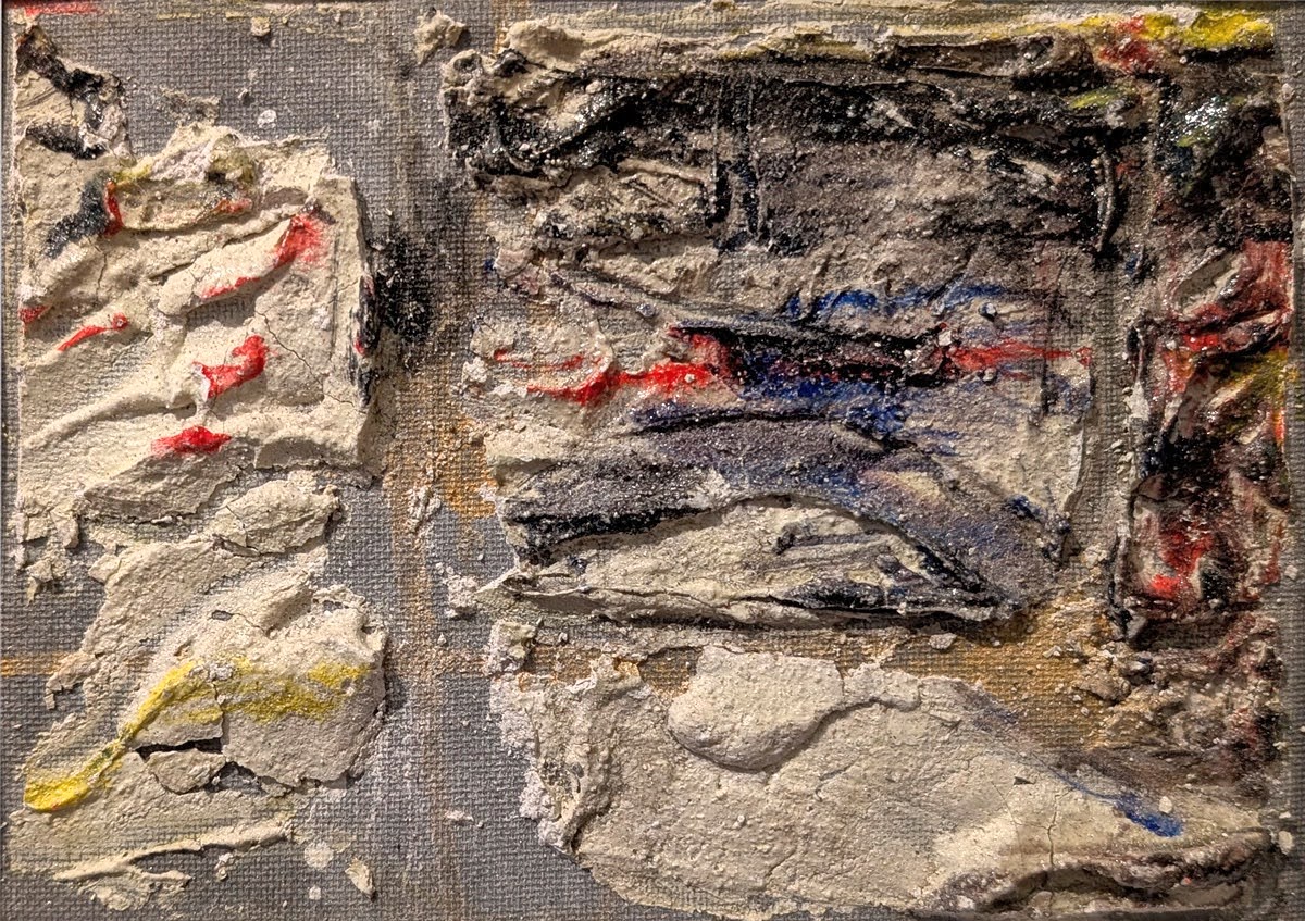 Technique & Materiality: Presented in a horizontal format (32 x 23 cm), Embers offers a panoramic view of thermal energy. The combination of acrylic and plaster on canvas generates a “tide” of heat flowing across the canvas. The plaster encapsulates pigments that seem to radiate light from within, ensuring the painting appears to be in a state of perpetual incandescence, like a river of lava finding its limit.