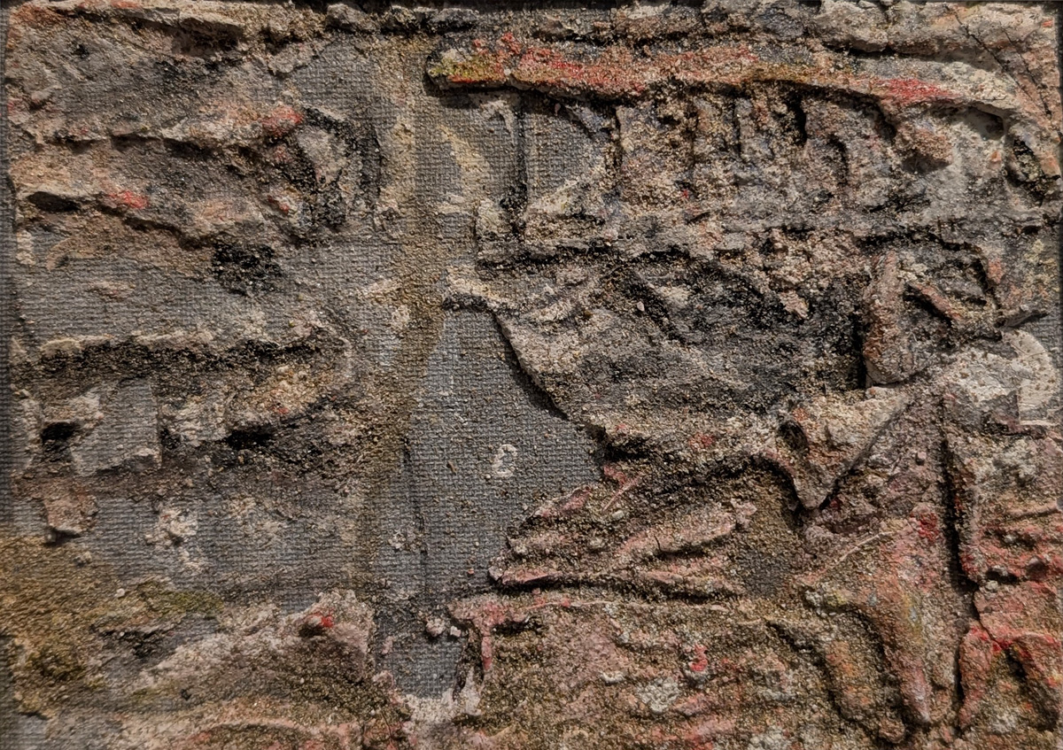 Technique & Materiality: Foam is a delicate study of sculptural effervescence. While its companion pieces explore the weight of the shore, this work focuses on the transitory nature of sea spray. The artist utilizes plaster in high relief to create a porous, bone-like structure that seems to dissolve into the canvas. By layering washes of mineral grey and charcoal against sudden, sharp textures, the work achieves a unique rhythmic vibration. In its 23 x 32 cm format, the contrast between the raw, exposed canvas and the dense modeling paste creates a surface that demands to be explored by touch.
